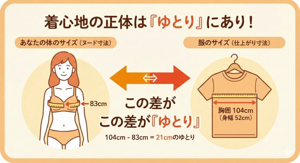 そして、このヌード寸法と仕上がり寸法の関係性こそが、着心地の良し悪しを決める「結果」を生み出します。具体的には、この2つの寸法の差が「ゆとり」になるのです。この「ゆとり」こそが、モデルさんが着ているような「いい感じのフィット感」の正体です。