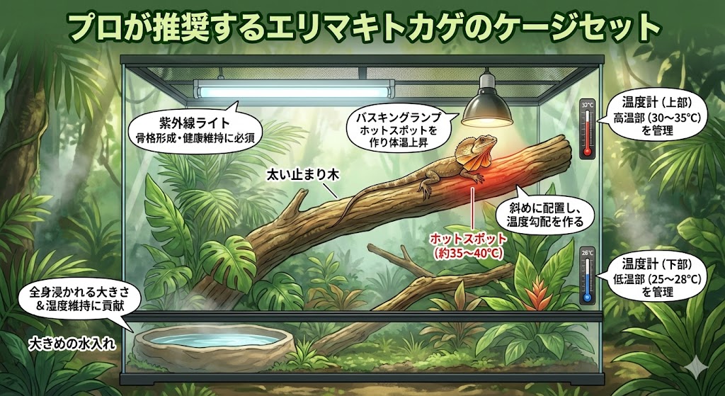 エリマキトカゲは樹上性のため、横幅よりも「高さ」を重視したケージ選びが重要です。