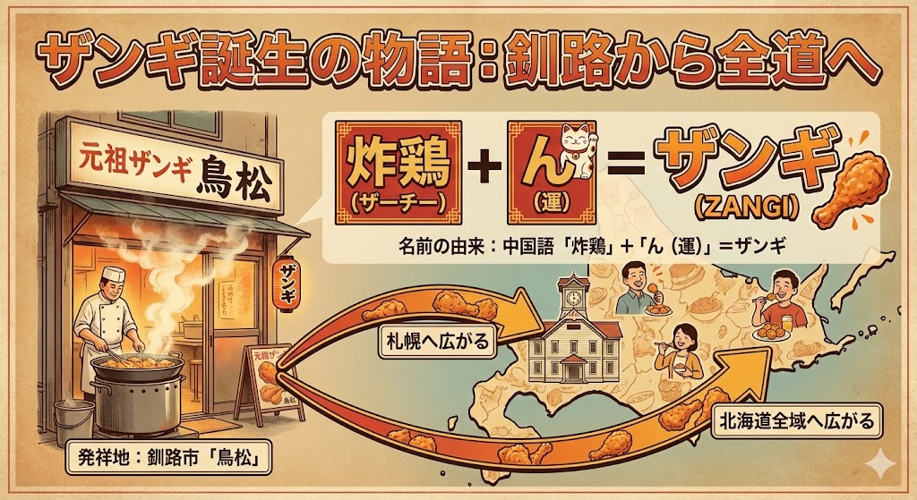 - 釧路の「鳥松」から始まり、運を呼ぶ名前として「ザンギ」と名付けられた。