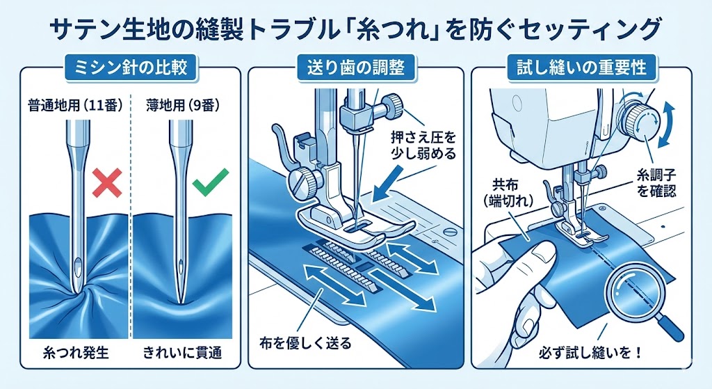 - ミシン針と糸: サテン生地は織り目が細かいため、太い針を使うと「針穴」が目立ったり、糸がつれたりします。必ず「9番(薄地用)」のミシン針と、「90番(薄地用)」のミシン糸を使用してください。